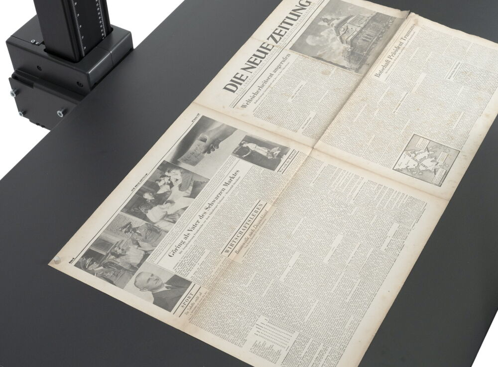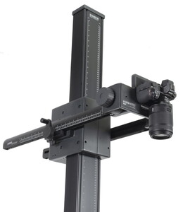 Heavy-duty copy stand for digital and analogue image capturing work with two-level motor-driven adjustment. Accepts originals up to 129 x 89 cm (50.8 x 35 in.). Extremely sturdy column, made of a multi-section special extrusion, black anodized, with printed cm and inch scales. Column foot made of double strutted steel tube. Cast aluminum base for bolting the column, with built-in spirit level. Four levelling feet.