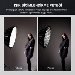 Petek ızgaranın kullanılması, ışık şeklini daha sınırlı ve yönlü hale getirir. Bu da ışın açısının 45°'de yoğunlaşmasına olanak tanır. Bu ışık, fotoğrafçılara modellerinin yüz yapısını tanımlamak için dramatik ve etkileyici bir ışık efekti sağlar. 2 adet yüksek kaliteli difüzör birlikte ya da tek tek kullanılabilir.