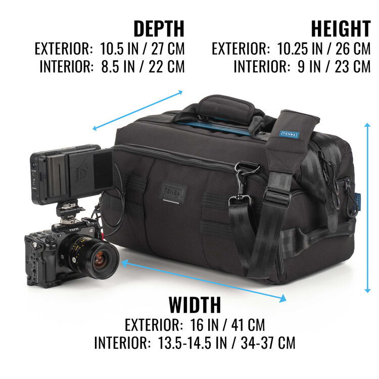 Tenba'nın, Cinelux V2 16L Siyah omuz çantası; Aksesuarları takılı bir video kamera ya da, DSLR body ve lensleri ile aksesuarlarını birlikte taşıyabilir.
