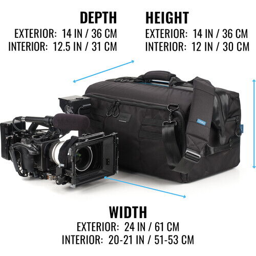 Tenba'nın V2 omuz çantası, aynasız, DSLR veya sinema kameralarını üstünde takılı ekipmanı ile taşıyabilir.